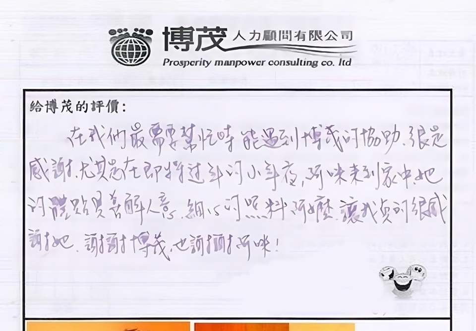 在我們最需要幫忙時,能遇到博茂的協助,很是感謝,尤其是在即將過年的小年夜,阿咪來到家中,她的體貼與善解人意,細心的照料阿嫲,讓我真的很感謝她,謝謝博茂,也謝謝阿咪!