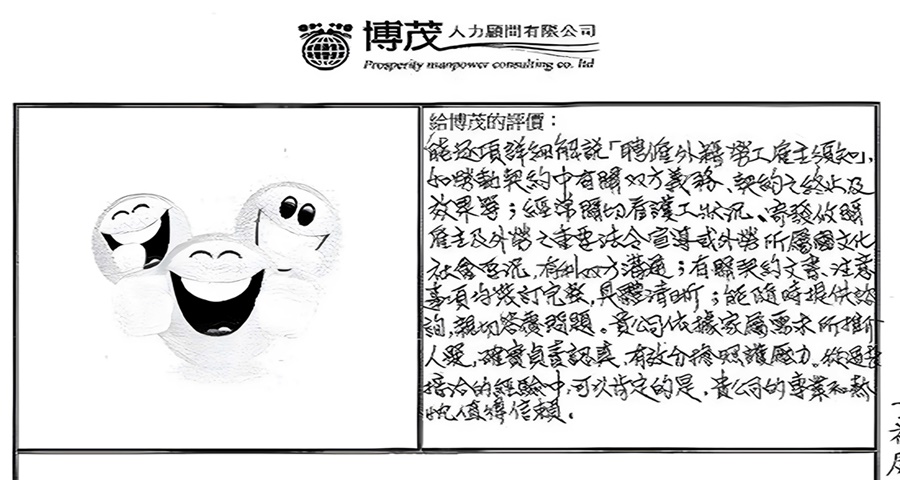 能逐項詳細解說「聘僱外籍勞工雇主須知」,如勞動契約中有關雙方義務,契約之終止及效果等;經常關切看護工狀況,寄發攸關雇主及外勞之重要法令宣導或外勞所屬國文化社會近況,有利雙方溝通;有關契約文書,注意事項均裝訂完整,具體清晰;能隨時提供諮詢,親切答覆問題。貴公司依據家屬要求所推介人選,確實負責認真,有效分擔照護壓力。從過去接洽的經驗中,可以肯定的是,貴公司的專業和熱忱值得信賴。