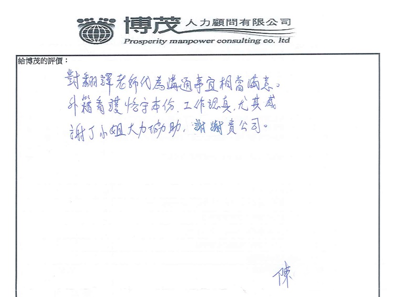 外籍看護恪守本份,工作認真,尤其感謝丁小姐大力協助,謝謝貴公司